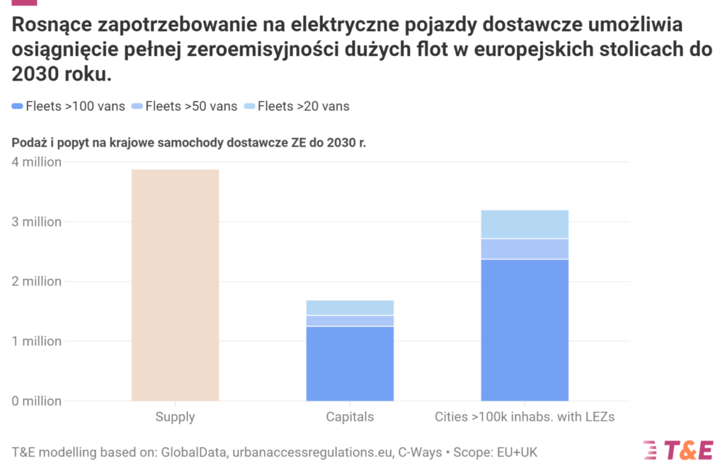 Prognozuje się, że między 2025 a 2030 rokiem w UE i Wielkiej Brytanii sprzedanych zostanie 3,9 miliona elektrycznych vanów [1], [2]. Jak pokazuje nowa analiza przeprowadzona przez Transport & Environment i Clean Cities Campaign, to wystarczająco dużo, aby umożliwić wszystkim 27 stolicom UE, a także Londynowi, wprowadzenie stref bezemisyjnych dla transportu towarowego,. Floty, których dotyczą planowane strefy bezemisyjnego transportu towarowego ? czyli te składające się z ponad 100 pojazdów ? pochłonęłyby jedynie 32% krajowej podaży. Nawet jeśli strefy bezemisyjne rozszerzono by także na firmy posiadające mniejsze floty (liczące ponad 50 lub nawet 20 pojazdów), nadal będziemy mieć wystarczająco dużo, produkowanych w UE, elektrycznych samochodów dostawczych, aby zaopatrzyć w nie 28 stolic. Oznacza to, że wszystkie europejskie stolice mogłyby całkowicie wyeliminować floty dostawczych samochodów spalinowych do 2030 roku.