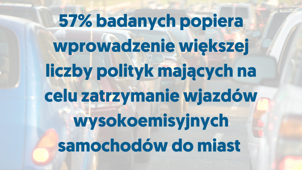 - 57% osób w obydwu miastach popiera wprowadzenie większej liczby polityk mających na celu zatrzymanie wjazdów wysokoemisyjnych samochodów do miast np. tworzenia stref czystego transportu lub zamknięcia ulic przed szkołami i przedszkolami dla zanieczyszczających powietrze pojazdów